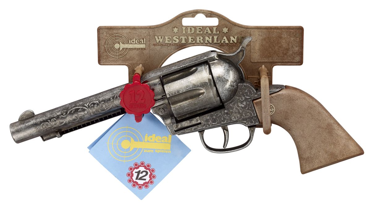 Mit der silber-braunen Spielzeugpistole „Samuel Colt Antik“ kommen große und kleine Pistolenfans voll auf ihre Kosten. Egal ob Indianer oder Cowboy – diese 27 cm lange Spielzeugpistole verleiht dem Faschingskostüm den letzten Schliff. Die 12-Schuss-Pistole aus Zink und Kunststoff verfügt über einen handlichen Pistolengriff. Als Munition eignet sich am besten die 12-Schuss Ring-Amorces Typ Wicke EURO CAPS® des Herstellers Sohni-Wicke. Dank der hochwertigen Verarbeitung ist langes Spiel, Spaß und Action garantiert. Nicht geeignet für Kinder unter 3 Jahren.